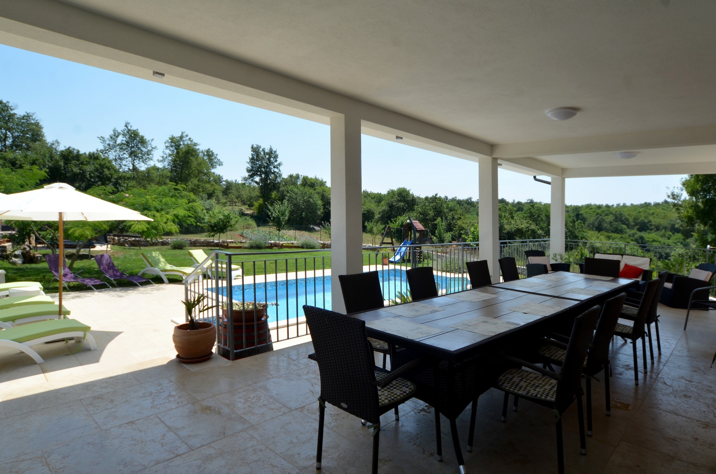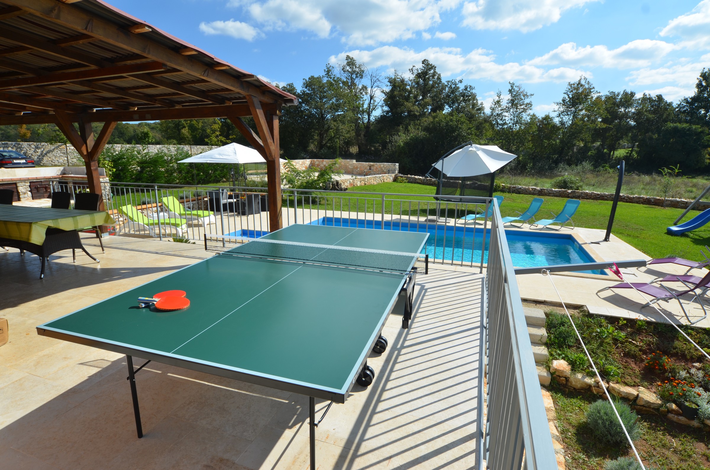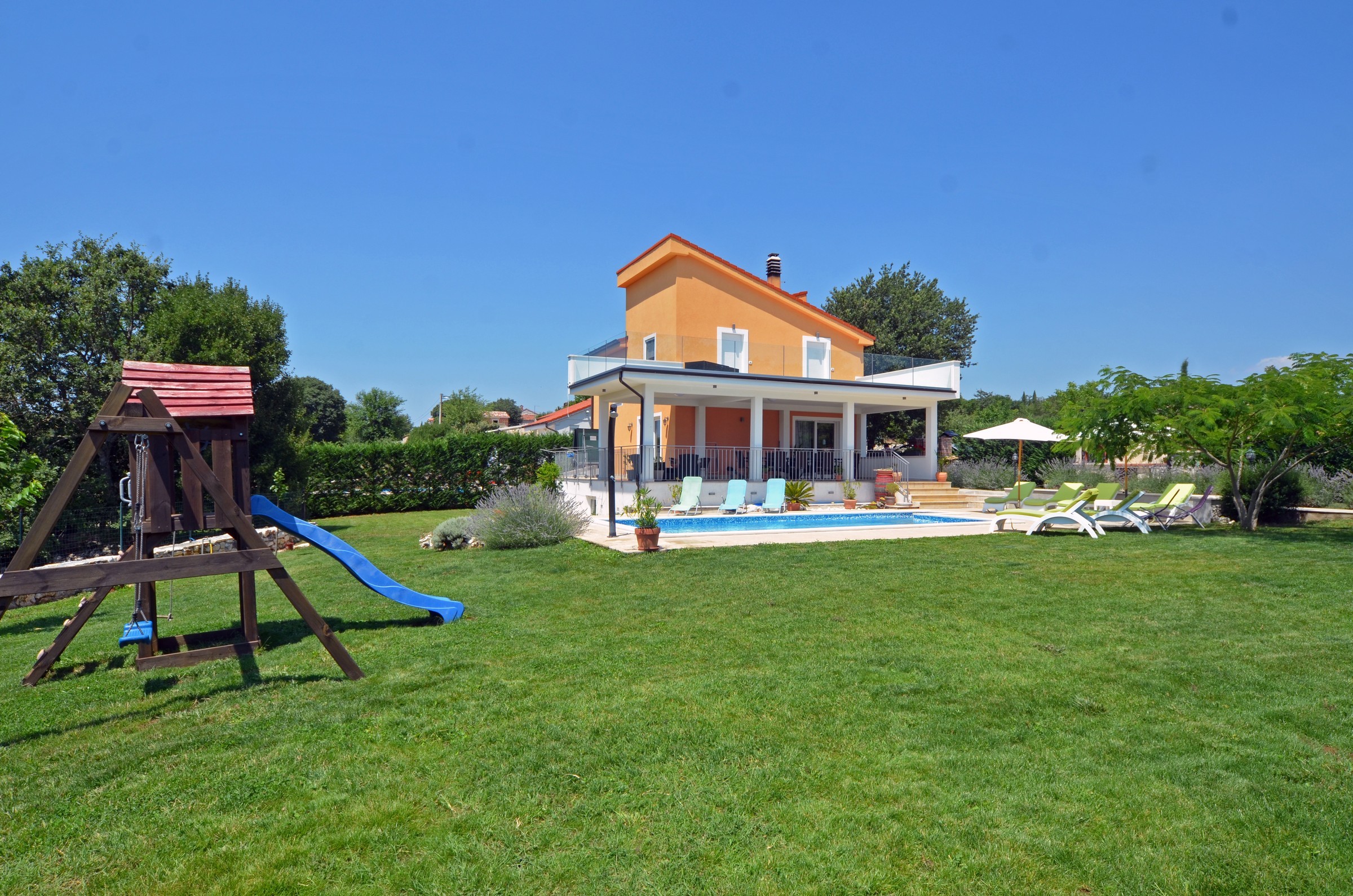 Vila s vanjskim bazenom i vrtom smještena u mirnom selu u blizini Rovinja. Moderna i uređena vila s 4 odvojene spavaće sobe, 3 kupaonice, dnevnim boravkom i blagovaonicom u jednom prostoru. Kuhinja je u potpunosti opremljena, a u podrumu se nalazi teretana i prostor za igre, uključujući biljar. Prostrana vanjska terasa od 60 m² i balkon pružaju lijep pogled na zelenilo. Na raspolaganju su privatni parking i dječje igralište na otvorenom. Uključena su 4 bicikla za besplatno korištenje. Kućni ljubimci su dopušteni. Pušenje je dozvoljeno isključivo na otvorenom. Drugi dječji krevetić dostupan je besplatno na upit.